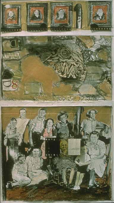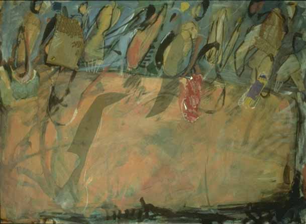 acrylic, pastel, charcoal, paper & plastic on board, 1992