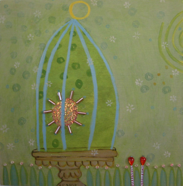 6"h x 6"w, acrylic, beads & glitter on wood, 2003
